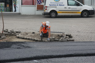 Nee, dit zijn geen teamspelers die de rode kaart hebben gekregen en voor ‘straf’ mindere klusjes krijgen te verrichten…. Links een stratenmaker van Spoelstra & Nijboer, ook zondagactief, rechts een teamspeler van de Wemac, op de rand van buitenspel…