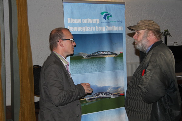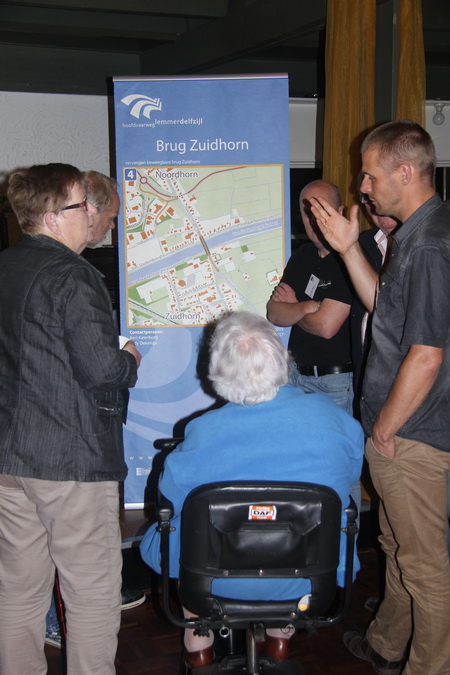 De meeste aandacht ging toch uit naar de vervanging van de krakende tafelbrug tussen Noord- en Zuidhorn. Hoe is de vorm na de versobering? Hoe hoog, hoe breed? Materiaal? Kleuren? En het talud, blijft dat berijdbaar voor iedereen??!