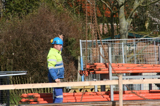 Gerben dirigeert…. In contact met de kraanmachinist….