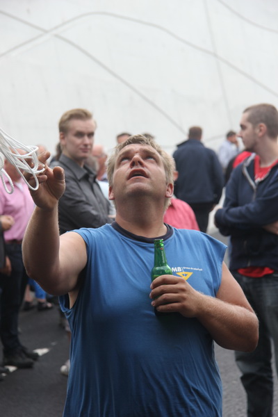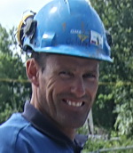 Aaldert met zijn werkattributen aan de noordoostkant van de tunnelkuip. Hij neemt de buitenzijde van de tunnelbak onder handen…