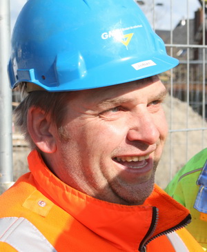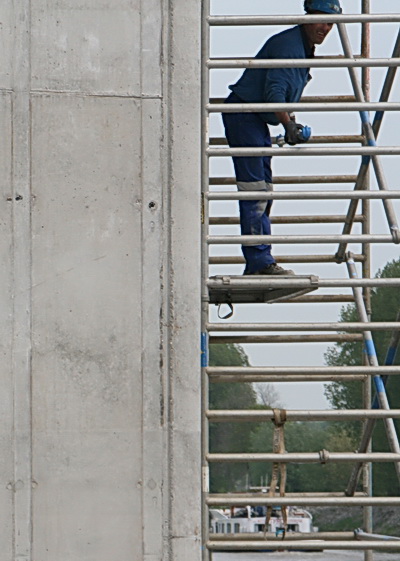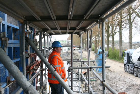 Aaldert bij de kanaalkant van de noordelijke pijler van de NVH-brug (in aanbouw).