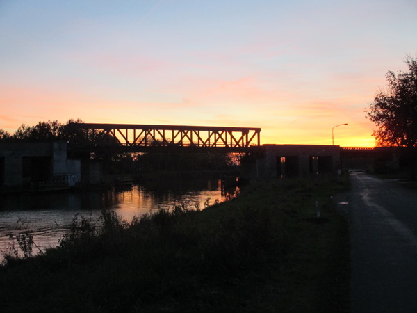 De spoorbrug met een restje zonsondergang…. Eigenlijk ben ik te laat, had ik de route andersom moeten lopen… Je kunt ook zeggen dat ik te vroeg ben… In november/december is de zonsondergang vanaf deze plek mooier boven de spoorbrug.