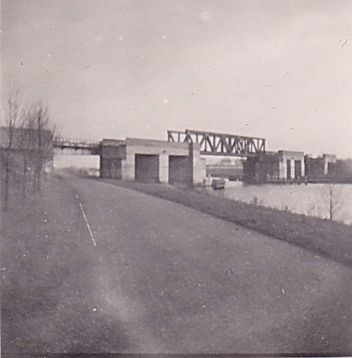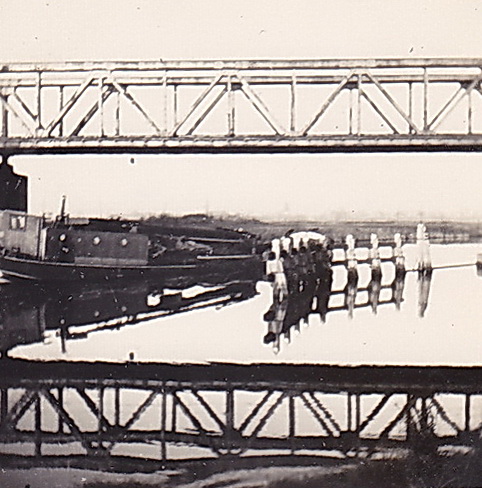 Een speelse foto, ook uit 1948! Doorkijkje onder de spoorbrug met weerspiegeling in het kanaalwater. Links ligt een boot, is moeilijk te duiden. Aanvoer van wat?! En waar vandaan is de foto genomen?!