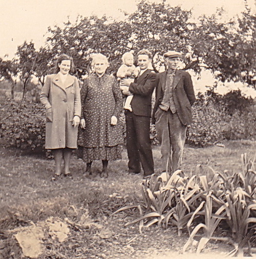 Leden van de familie Lodewegen! Rechts (groot)vader Jan Lodewegen, tweede van links (groot)moeder Mart Lodewegen-Kazemier! (Zus van Leendert Kazemier, tante van o.a. Giny de Jager-Kazemier) Met de kleine Jacob op de arm: Johannes Lodewegen! Ooit een bekend sportman in Noordhorn en wijde omgeving, vooral als wielrenner! En vanzelfsprekend herinneren heel veel mensen zich Joh. Lodewegen als badmeester, o.a. in “Electra” bij Oldehove. Links staat Trijn Lodewegen-Ploeg, vrouw van Johannes, moeder van Jacob. Gefotografeerd achter het huis van de Lodewegens aan de Achterweg, bij de moestuin.