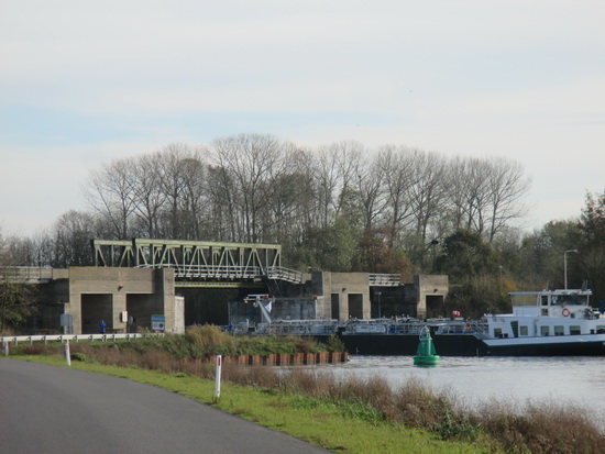 De oude spoorbrug met zijn bunkerkarakter… De ‘Veendam’ schuift er onder door….