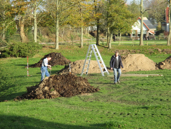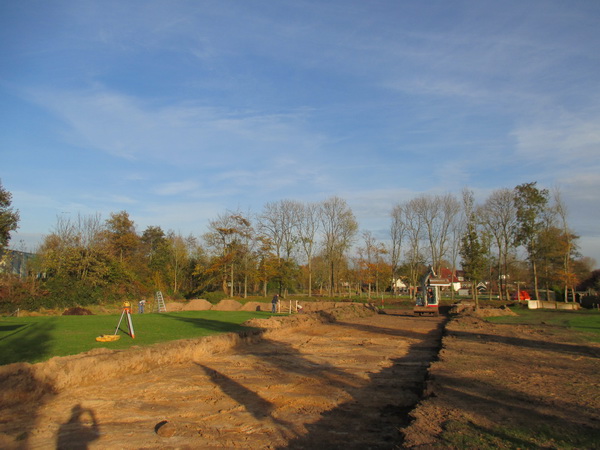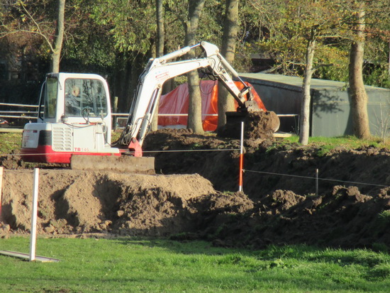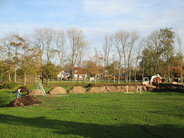 Het uitgraven is al flink gevorderd. Rechts op de achtergrond nog net een gedeelte van de vroegere ‘paardenstal’, de kinderverkleedruimte bij het open luchtbad (1930-1970)