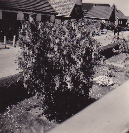 Een bloeiende krulhazelaar??! In de tuin van de Lodewegens. Aan de overkant de oude situatie van de Achterweg. Links het huis waar Schuitema heeft gewoond, maar ook families als Nijenhuis, Hekkema, Bierling? In het midden het huis van aannemer/timmerman Rietsema, verder naar rechts de woning van Roeters en dan komt het dubbele huis van o.a. Mekke en Jantje van Dijk en Jan Nijenhuis. De huizen van Rietsema en Roeters staan er nog, nu bewoond door respectievelijk de familie Stoepker en Tjibbe en Janny Werksma.
