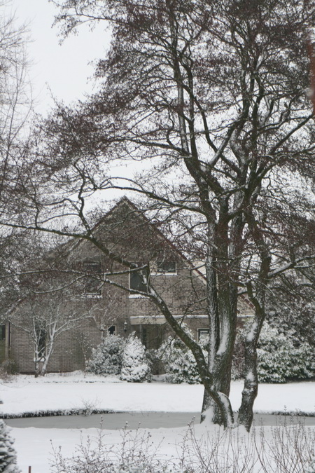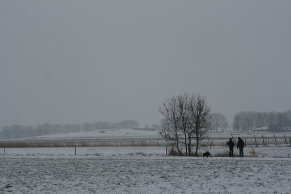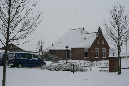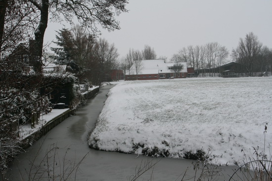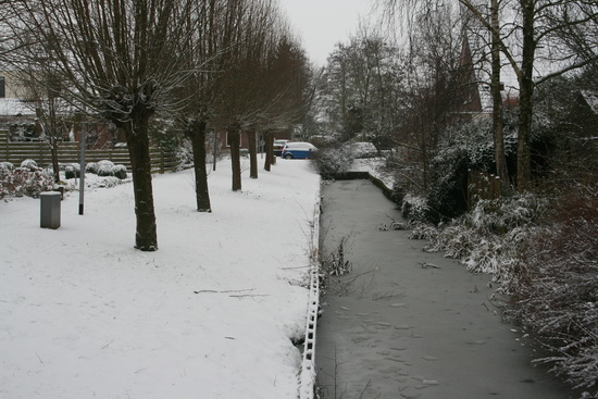 Het gedeelte van de Borgweg dat dwars op de eigenlijk weg staat, met gracht. Besneeuwd en wel… Hier hoort denk ik het verhaal bij dat ik te horen kreeg van aanwonende, Anna Schouten. Anna vertelde dat ze in/bij het water en de struiken een eend zag die hopeloos verward zat in een stuk nylondraad. Het dier kon zichzelf niet bevrijden. Anna sprak erover met een jonge vader die langs kwam, samen met zijn kind. “Hij bedacht zich niet, deed zijn schoenen en sokken uit, waadde door het ijskoude water naar het dier in nood en bevrijdde het! Ik wilde een handdoek voor hem halen, maar hij wimpelde het weg en zei dat hij dichtbij woonde, aan de Meidoornstraat!” Anna achterhaalde de naam van de dierenliefhebber: Elroy Oosterhof! Zoals Anna zei: “Voor mij is hij een held!” Kindlief vond het ‘heel gewoon’ wat pappa deed, had meer aandacht voor zijn nieuwe laarsjes: “Kijk eens!”