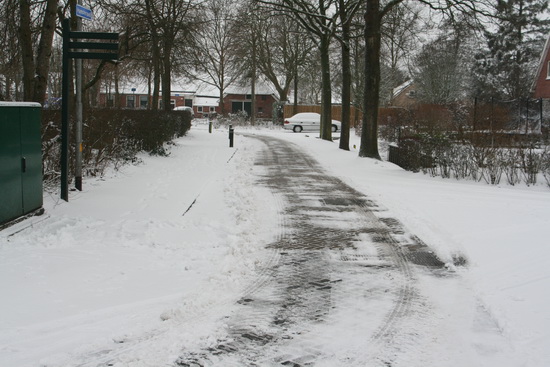 De eerste straat waar sneeuw is geruimd, met de gemeentelijke sneeuwschuiver. Hamsterpad, bij de Samenwerkingsschool. De schoongemaakte route loopt via de Meidoorn- en de Kastanjestraat naar de Oosterweg.