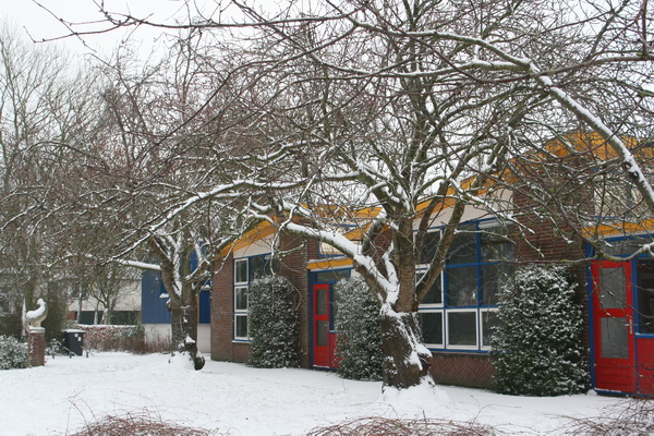 De voormalige OBS De Molshoop vanaf de straatkant, kleurig in het wit, een ‘keurige bruid’….
