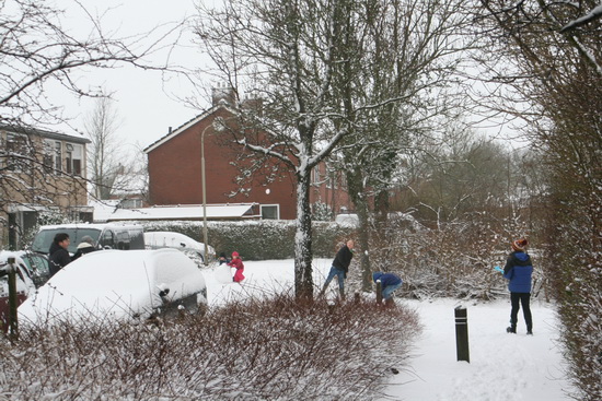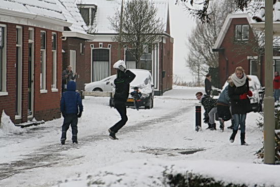 Ook bij ons huis aan de Verlengde Oosterweg woedt een sneeuwballenstrijd, waaraan vooral de Buurtjes deelnemen. De gooiers weten prima het verschil tussen meedoeners en passanten….