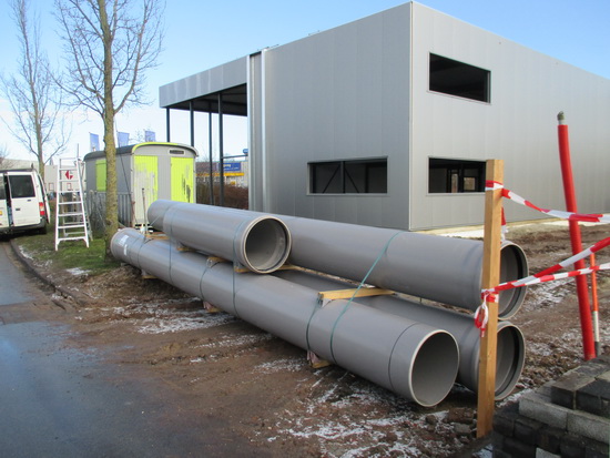 De nieuwe BE-JO hal aan de Industrieweg, met grote buizen voor de deur… “Regenpijpen”…. aldus een Kode Profielmedewerker. Een twinkeling in zijn ogen verraadt hem. De buizen zijn nodig vanwege het dichtmaken van een deel van de naastgelegen Noordhorner Tocht.