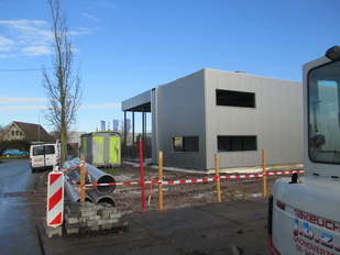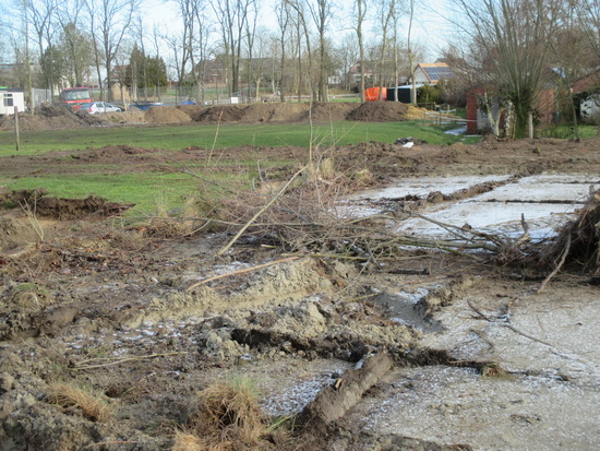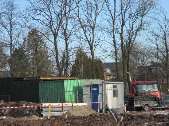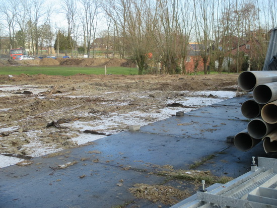Het nogal provisorisch ogende ‘bouwwerk’ van JBZ tussen de nieuwe BE-JO hal en de oude zwembaddijk met bomenrij. Onduidelijk wat daar gebeurt…..