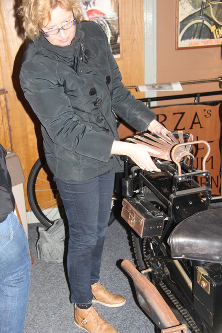 Gerrie van Agteren-Birza toont hoe de verhoogde zit voor de duopassagier achterop de motor kon worden gemonteerd.