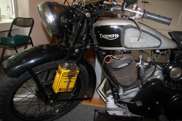 De aloude TRIUMPH, waarop grootvader Jan Birza menige rallye en toertocht heeft gereden en waarmee hij werd afgebeeld op de groepsfoto aan de Langestraat Noord in Noordhorn.