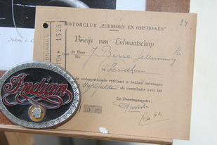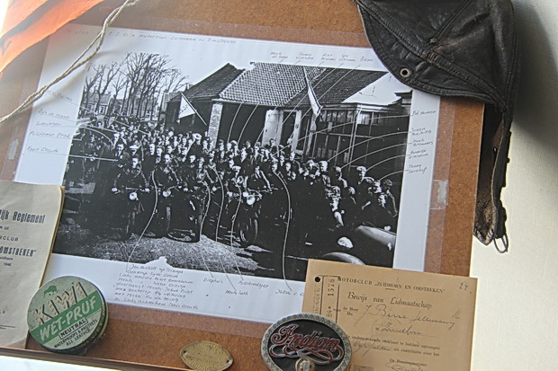 Links het ‘Bewijs van Lidmaatschap’ van de Motorclub Zuidhorn en Omstreken, ten name van Jan Birza, de vader van Koos Birza (de man achter het museum, helaas overleden) en de grootvader van Gerrie van Agteren-Birza (die ons een degelijke rondleiding door het museum gaf!) Jan Birza staat ook op de groepsfoto, met zijn motor, een “Triumph”.