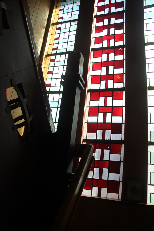 De schitterende ramen bij de trapopgang. (De bovenste verdieping van het Birza bedrijfsgebouw is een ontwerp van architect Siekman).