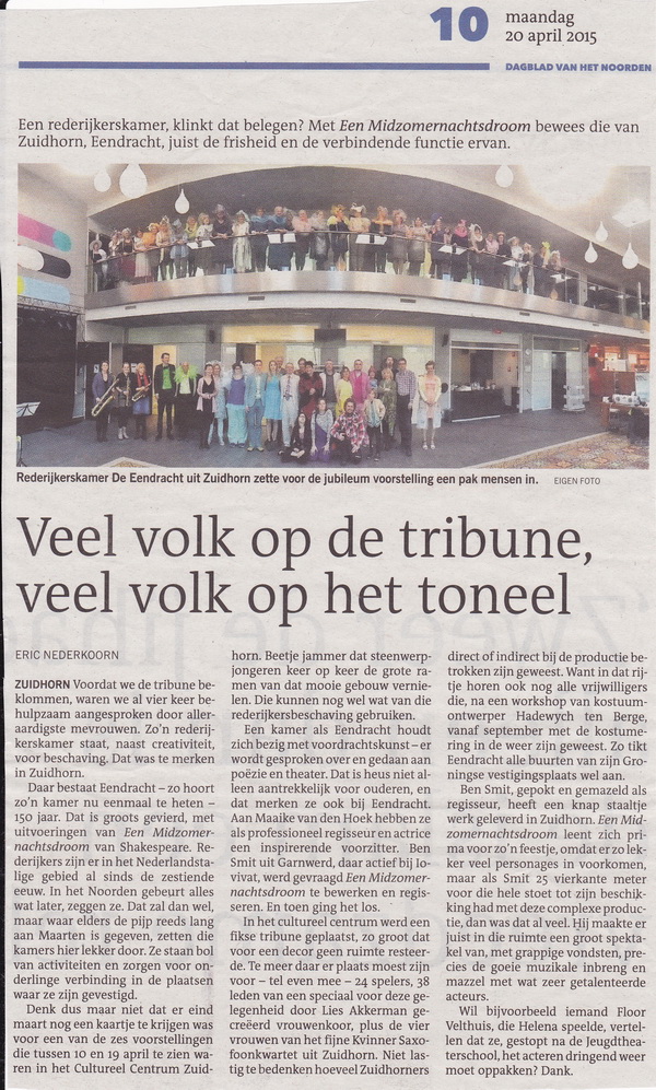 De rederijkerskamer “Eendracht” bestaat 150 jaar! Dat is niet alleen een welgemeende felicitatie waard, maar ook de weergave van een artikel met foto in het “Dagblad van het Noorden”: