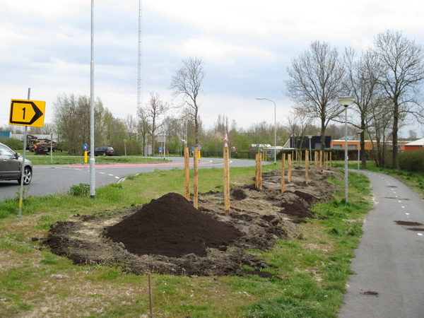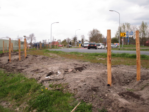Aan de westkant van de rotonde is gewerkt. Er staan steunpaaltjes in drietallen, er zijn plantgaten, er ligt tuinaarde……