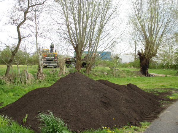 Tuinaarde om de plantgaten bij te vullen?! Opmerkelijk hoe de mishandelde wilg (geroosterd op Oudejaarsdag 2014…) zich in leven probeert te houden….