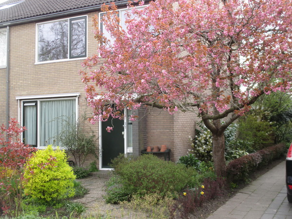 Weer thuis, waar onze Japanse kers eveneens begint te bloeien, gelijke tred houdend met de Molshoop-prunussen. Als de laatste aprilregen (die op zich welkom is!) de bloesem nu maar niet al te zeer “verinneweert”…..