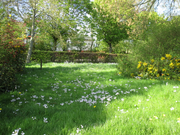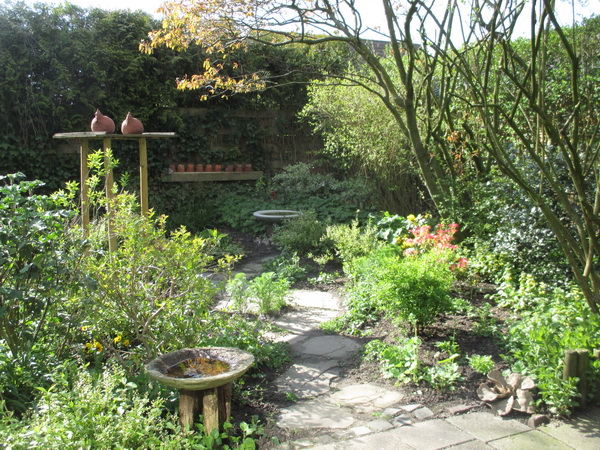 Onze eigen achtertuin, waar we een van de twee voedertafels hebben verwijderd; op de andere prijken twee werken van Gé. Voorlopig voeren we daar geen vogels bij, te veel overlast van torenkraaien die de andere vogels verdringen…. Dichter bij de achterdeur ga ik nog wel even door, al zijn de kauwtjes in staat ook daar hun ongewenste opwachting te maken….