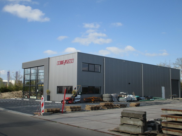 De nieuwe BE-JO verkoophal die inmiddels in gebruik is genomen zonder poespas. De parkeerplaatsen aan de Industrieweg zijn te gebruiken; de andere aan de zijkant moeten nog even wachten, er liggen nog steeds pallets in de weg….