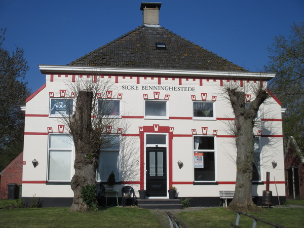 De voormalige “Witte Hoeve”, nu appartementengebouw “Sicke Benninghestede”. Liefhebbers voor woonruimte kunnen terecht in het voorste gedeelte. Links is een appartement te huur, rechts een te koop….. De geknotte bomen neem je op de koop toe….