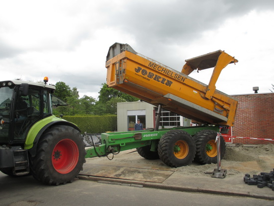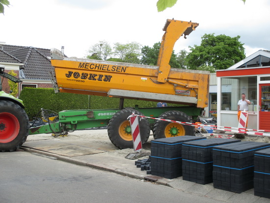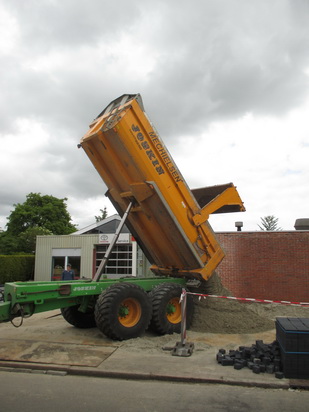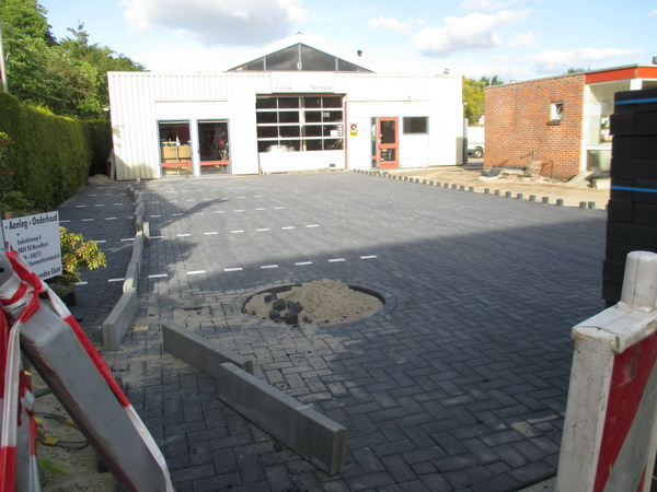 Nog meer zand voor de stratenmakers die de nieuwe oprit van garage Pijpker van zwarte stenen voorzien…
