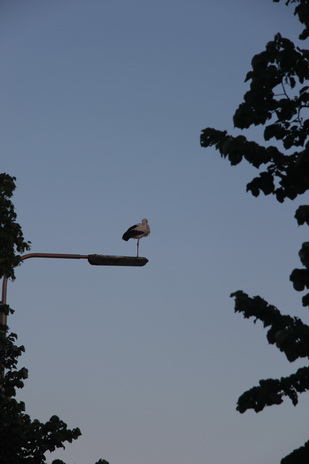 Telefoontje van Ina van der Mark, zaterdagavond plusminus half tien… Of ik weet dat er al een paar avonden achter elkaar een ooievaar op een lantaarnpaal zit tegenover huize Van der Mark aan de N355… Nee, dat wist ik niet. Wel zag ik vorig jaar twee keer enkele ooievaars op de meerkoppige lantaarnpaal bij Koopman Transport, maar déze had ik nog niet gespot. De grote Canon gepakt, klompen aan en op Gé haar Sparta naar de gemelde eiberstee. Anne Tillema is ook ter plekke, net als zijn buurvrouw. Anne kiekt met een tablet, of is het een I-pad?! Ik doe het met mijn Canon. Enkele resultaten: