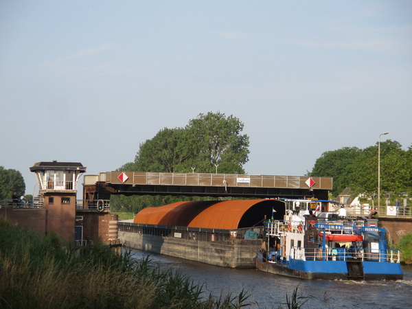 Vanavond tijdens onze rondwandeling langs o.a. het Van Starkenborghkanaal een bijzonder scheepstransport gezien. Een grote buis? Een immense pijp? Het paste in ieder geval nog net onder de hoog geheven tafelbrug….