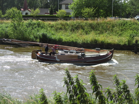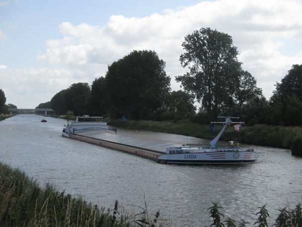 De LINDA glijdt zwaar beladen zonder al te veel motorgedruis van oost naar west richting Tolhek en sluis bij Gaarkeuken. Op de achtergrond de vaste hoge brug die het afgelopen jaar werd gebouwd.