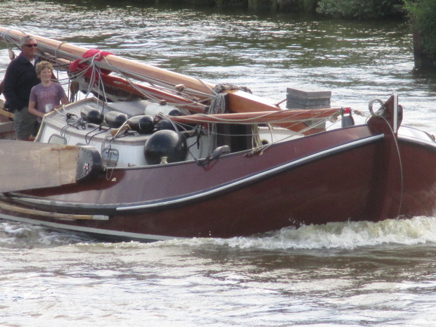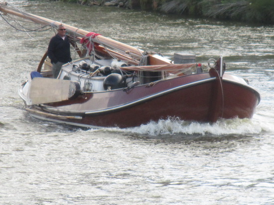 In het kielzog van de LINDA een prachtige plezierboot met neergehaalde mast. Vaart dus op de motor met een gebruinde ‘zeeman’ aan het roer.