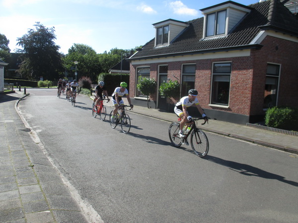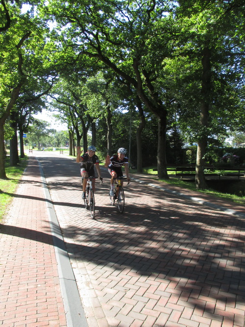 Vanmorgen om een uur of negen zijn we gaan wandelen. De temperatuur was (nog) aangenaam en dan kun je er maar beter vroeg bij zijn. Een heel rustige zondagmorgen, tot we de via de parallelweg naast de N355 terug gingen richting dorp. Plukjes wielrenners kwamen ons achterop fietsen, soms ontspannen keuvelend, de meeste racend, alsof het om een echte wedstrijd ging. Heel wat van die fietsers kozen trouwens voor de N355 zelf, het ging blijkbaar sneller via die rijbaan. Bordjes met pijlen en afstanden (110 en 165) gaven aan dat we op de route zaten van de Bauke Mollema fietstocht 2015. Nou, betere weersomstandigheden konden de organisatoren (inclusief Bauke zelf, hij ging 110 km fietsen deze dag) zich niet wensen!