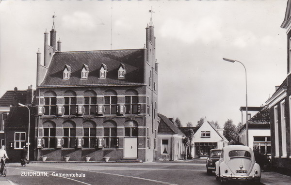 Op de kaart een fraaie afbeelding van het toenmalige gemeentehuis aan de Hoofdstraat met rechts op de voorgrond de Volkswagen Kever van de fotograaf. Dat deed de man wel vaker, vertelde mij later mevr. Visser-van der Sluis, er zijn meerdere ansichtkaarten waarop de Kever figureert…