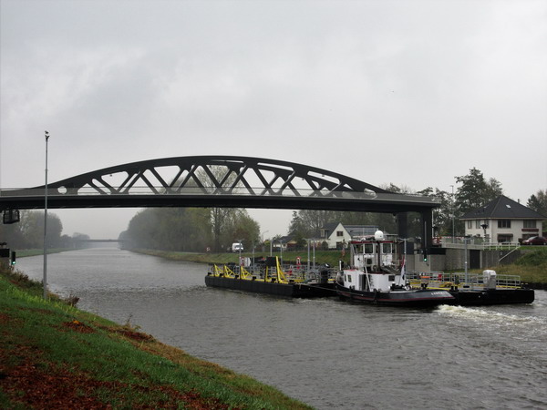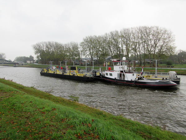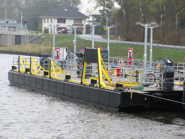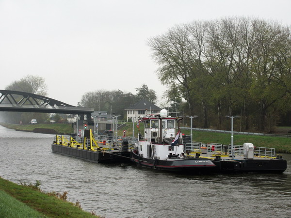 Bijzonder kanaaltransport! Duwer “Liberty” en drie met elkaar verbonden ‘platformen’…