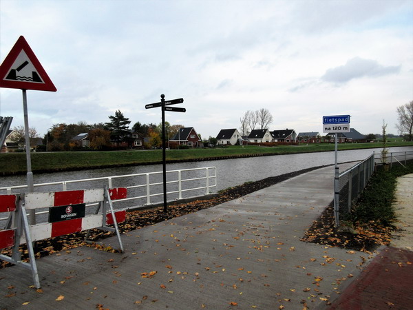 Bij de brug, aan de Zuidhornzijde van het kanaal, is het nieuwe fietspad richting Aduard open. Dat is een vooruitgang, nu binnenkort de brugverbinding naar het dorp Aduard verder weg komt te liggen.