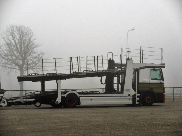 Koopman truck met lege oplegger, mist op de achtergrond.