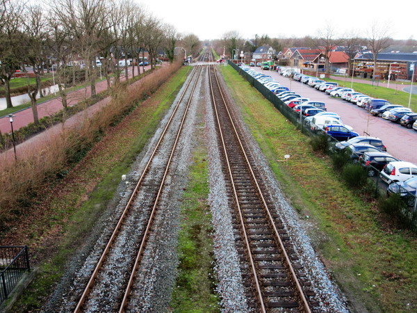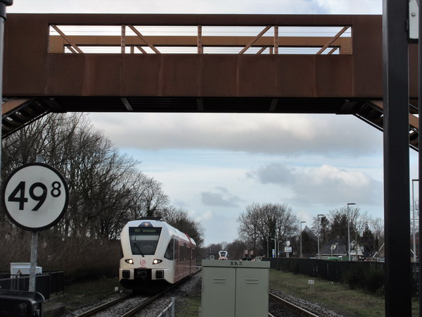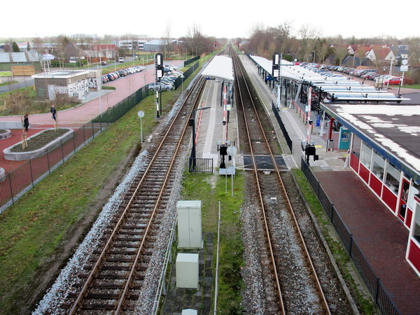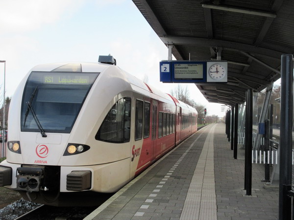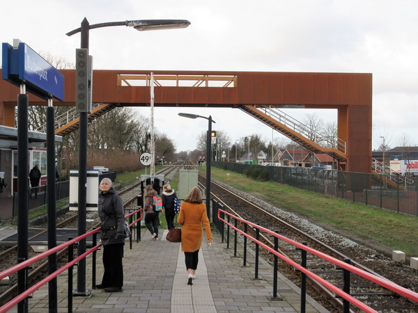 Uitgestapt in Buitenpost, vanuit Zuidhorn met de trein maar een kwartiertje…. Op de achtergrond de loopbrug over de sporen voor een snelle verbinding met o.a. de kringloopwinkel. Gé kijkt al vast even hoe laat er een trein terug gaat…