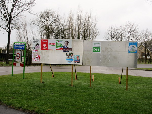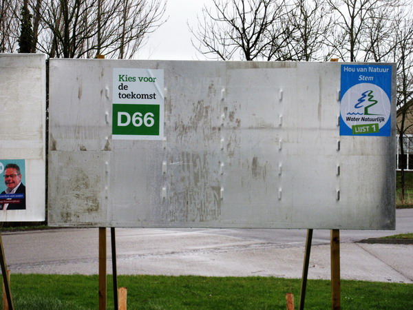Ondanks de stormachtige wind en de niet al te overvloedige nattigheid toch maar mijn rondje gelopen. Bij de verkiezingsborden aan de keerlus van de Langestraat Noord nieuwe ontwikkelingen, minder leuke. Leuk is nog wel dat D66 is aangeschoven en voor het nog bijna lege rechter bord heeft gekozen. Aan de linkerkant zijn minder leuke dingen gebeurd. In het duister van zondag op maandag? De SP-poster is vernield en dat is een minderwaardige daad, getuigt van weinig respect. Ook zijn de waterschapsposter van de PvdA en de grote CDA-verkiezingsposter van het bord gehaald. Zoiets hoort niet bij een faire verkiezingsstrijd. Of is er een verkiezingsbordenscheidsrechter actief die vindt dat elke politieke groepering maar een plek mag innemen? Maar dan nog, vernieling is niet goed te praten.Het linkerbord met de vernielde SP poster en zonder de PvdA waterschapsposter en de grote CDA-Brouns-poster. Vanwege de overlap met de Christen Unie verwijderd?!Dit bord kan nog wel wat diversiteit gebruiken. Het groen van D66 en het blauw van Water Natuurlijk is als combinatie geen streling voor het oog….Het geheel anno maandagmorgen vier maart nog eens vanuit een andere hoek….