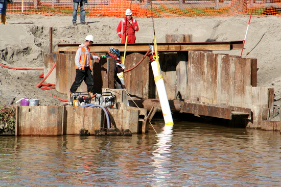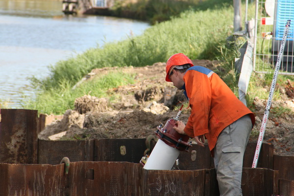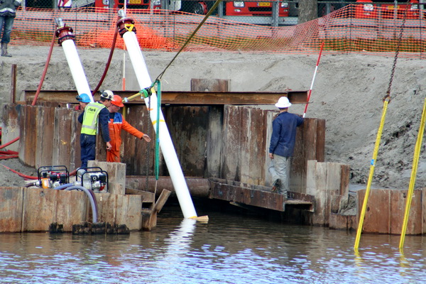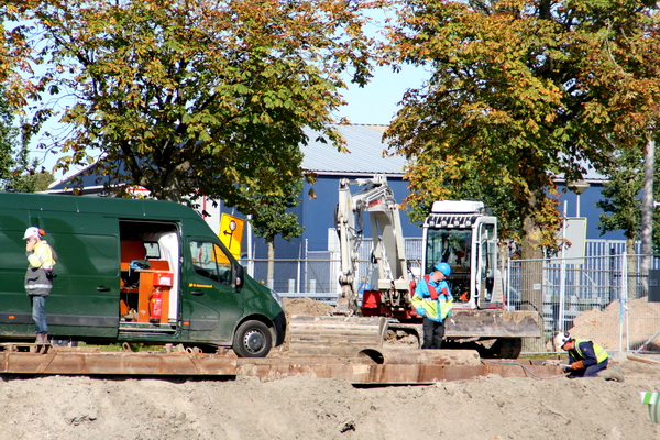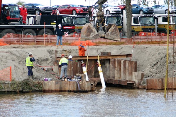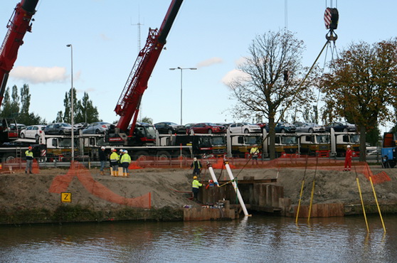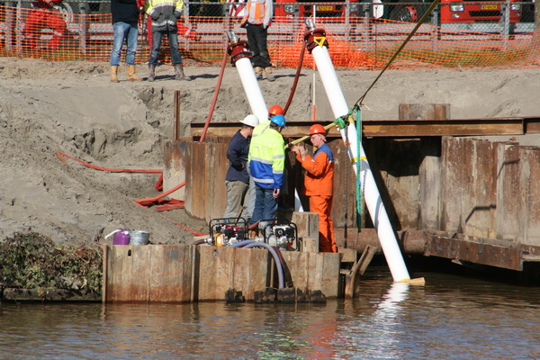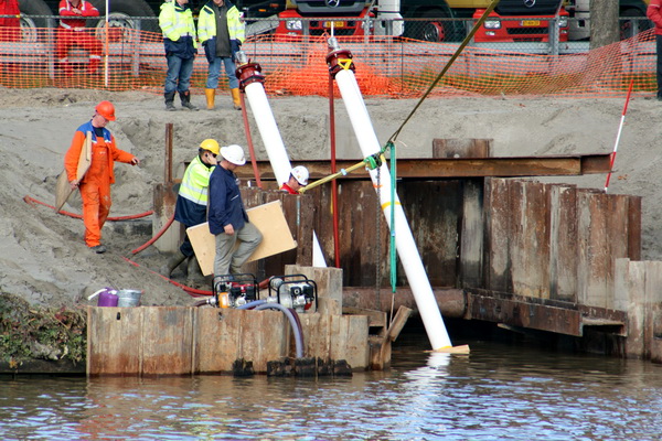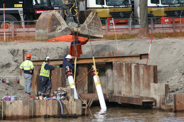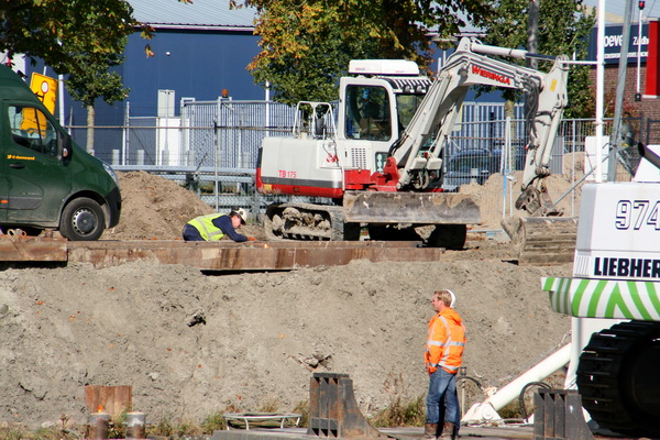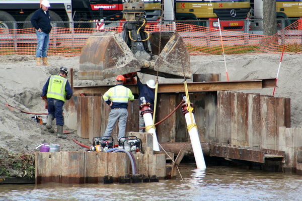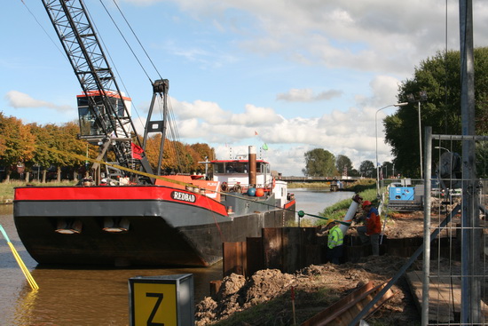 Aan de overkant van het kanaal bij de oude gymzaal van de Westergast werkt een eenzame grijper, scheef door de bocht, aan het wegwerken van de laatste plooien. Hier zijn de verzonken buizen van Gasunie en Enexis aangesloten op de vastelandleiding.