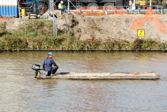 De werkplek aan de noordkant van het kanaal, op de hoek bij het parkeerterrein van Koopman Transport, wordt zo te zien ontruimd. Ook hier volgt alleen nog nazorg, de oever moet er weer keurig komen uit te zien….