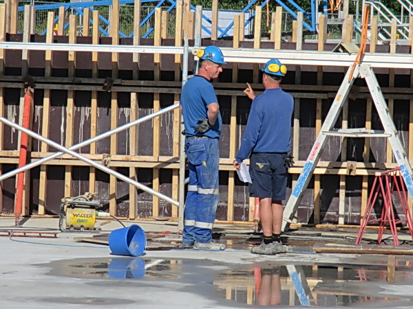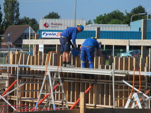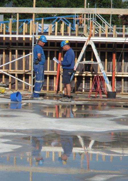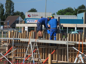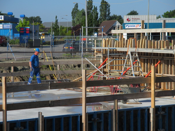 Even overleggen met een witgehelmde insider en voort gaat ie weer, de rijplaten worden nu haaks op de andere neergelegd… (De techniek van het rijplaten leggen, het gaat mijn pet te boven…)
