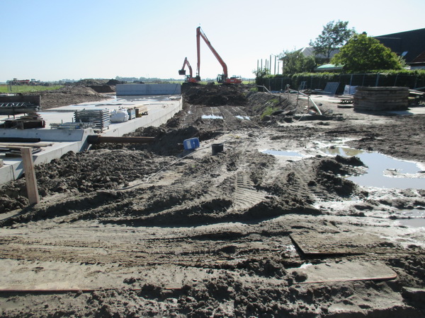 Bij de damwandkuip waar het onderzoek naar de geschonden verzonken buizen van Gasunie en Enexis plaats vindt, is een ‘Mammoet’ verschenen. (Het bedrijf in Assen is blij met de werkgelegenheidsprojecten in Noord- en Zuidhorn!)
