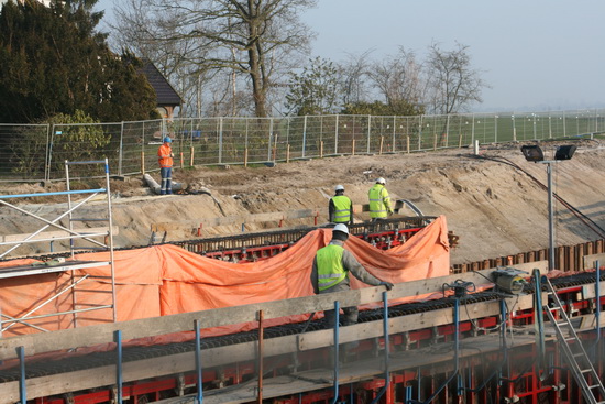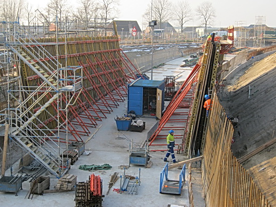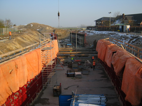 Overzicht van de tunnelkuip aan de oostkant, de segmenten 4, 3, 2, 1…. Op de grond in de tunnelkuip een aantal bekistingspanelen, grondig gereinigd en geolied (met dank aan de informatie van Fré Bisschop, zie www.noordhorntoenennu.com ), blijft er geen beton aan zitten…. De panelen op de grond worden achteraan rechts hergebruikt.