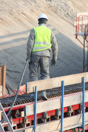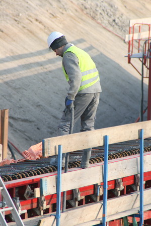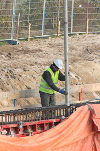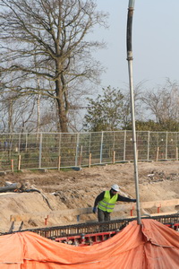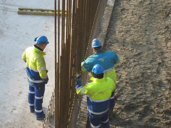 De van bekisting ontdane noordwand (binnenkant) met bovenop een bekende GMB’er die de wand van niet meer noodzakelijke attributen ontdoet. Op de grond de vele staaldraden die worden gebruikt voor de bewapening van de tunnelvloer bovenop het keldergedeelte.